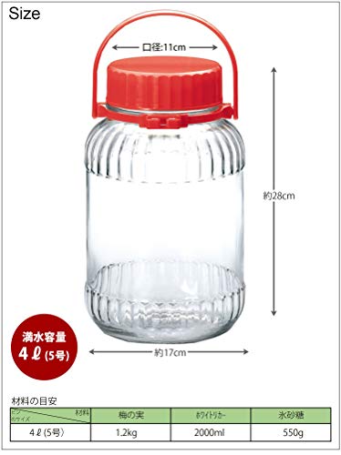 口の大きさは9.5㎝で、赤い蓋のビンと比べると狭いのが難点ではあります。そのため、1ℓ、2ℓサイズに少量漬けるのに活躍しそう!!4ℓはちょっと使いにくそうに見えます。サイズは大きくても、口の大きさは同じ。その為、口が狭く感じ、出し入れが不便に感じると思います。